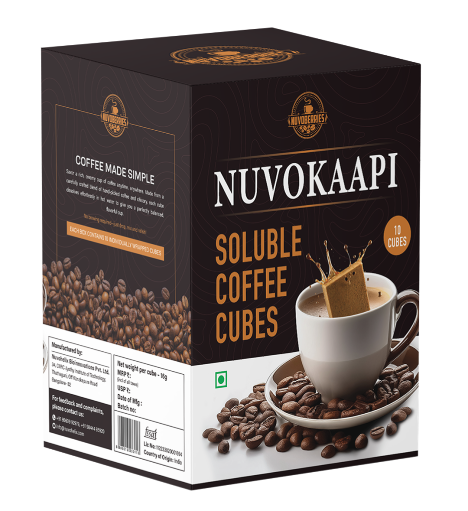 Nuvokaapi is a thoughtful innovation by Nuvohelix Bioinnovations, created to simplify your coffee moments. Born from the idea that great coffee shouldn’t require machines, mess, or guesswork, our cubes combine premium ingredients in a compact, easy-to-use format.